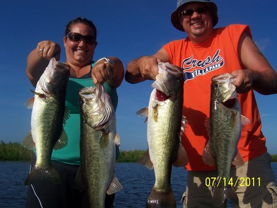 Today the water really cleaned up after all the resent rains and it was game on.I had Mike and Kim in from IL for a six hour trip and the first 3 to 4 hours were unreal with one big fish after another all coming on crank baits in 5 ft of water off main river shellbeds.Mike had a 5 fish limit that weighed 25 pounds and then another 5 fish limit that weighed 18 to 20 pounds and i lost count of total numbers.A couple real Trophies were lost as well.Water temps have cooled with the good current we now have in the main river.Lake Reports are saying mid 90's for water temps today we had 84 degrees here on the St Johns River and thats what makes the big difference in these Trophy Bass Biting.