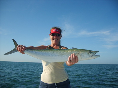 Cheryl had the "Catch of the Day" with a three foot black tip shark caught on fifteen pound test line. Cheryl Carter, husband Orion, and friend Mark Obrien all had some great action starting offshore catching spanish mackerel and the shark. Then we moved inside finding a school of hungry bluefish, a couple ladyfish, and one more mackerel. Coming back to the dock this crew had the makings of a great fish fry with nine blues, four spanish mackerel, and a black tip shark - great day on the water for all.