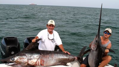 Once we had safely stowed this first fish we re-positioned the boat and made one last drop, around 1:45 pm. At around 3:20 pm the rod bent over and we had hooked another fish. Alex landed what turned out to be another broadbill swordfish 30 minutes later, though with much less excitement! This fish was smaller, with the short measurement at 57", and weighing in at 95 lbs. This is what daytime swordfishing is all about!