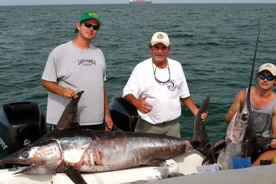 Australian anglers Johnno and Alex decided to spend one more day swordfishing before heading to Prince Edward Island and Bluefin tunas. We left the dock at 9:00 am this morning, a little late start, but that didn't matter. We made two drops in 1900 feet of water, and once the baits hit the bottom, it took 90 minutes before we got the first bite. Alex stayed on the rod after hooking the fish, which turned out to be a 280 lb swordfish. Once the fish was at the surface we prepared to haul the fish aboard. I was ready with a harpoon in case of any mistakes, and sure enough the leader broke on the fish! I threw the harpoon and got him, but now the fish was fired up and swimming back down to the bottom. We only had 600 feet of harpoon line that was disappearing fast so Alex and I quickly started tying anchor ropes together. First was a 300 foot piece, then a 200 foot one, and then every other dock line on the boat!