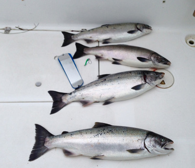 September fishing was very good for Coho in Barkley Sound until mid month and then it was important to run out to Big Bank if you were looking for salmon. In early September the Coho were about the same size as the Chinook and since the limit was 4 per person, it made it easy to go only 10 mins out of the harbor and fish Coho in protected water. The Coho were mostly in the 7-12 lb range and were at 20-50 feet mostly on 3 inch and 3.5 inch green/silver Silver Horde and Coyote Spoons.