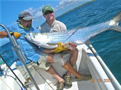 When my first fish breached the water, the most amazing sight I must say, and you said "My friend that is a fish of a lifetime" I new I was into a personal trophy. Two hours and forty five minutes later I landed my trophy tarpon, it was a 95 pound monster of a fish. That fish pulled us around and out to sea before she gave up. Couldn't count the number of times this fish jumped out of the water and spooled my line. You couldn't wipe the smile off of my face, for that matter I couldn't wipe the smile off my face because I couldn't move my arms…. It was a fish of a lifetime!