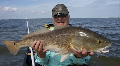 We gurgled up a few trout, then went on the hunt for redfish. It is not uncommon for anglers who attempt wading in the mucky lagoon mud to fall down. So it happened with Ed. I walked him around in the canoe and talked him into the biggest redfish of his life, which took a wool crab.