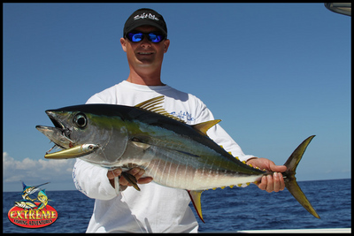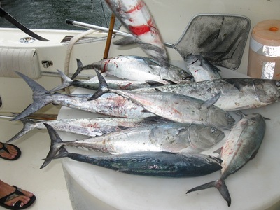 The past few days we have been catching plenty of v-liner (snappers), grunts, and kingfish. We have also had a few blackfin tunas, and bonitos. These fish are being raised on ballyhoo chunks and sardines.