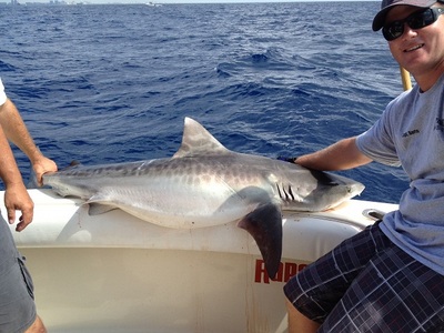 We moved the boat out in 400 feet of water and put out nice fresh bonito for bait. In less than an hour, angler Thomas was sitting in the fighting chair doing battle with a brute. We knew he had a big fish, but we had no clue as to what species. After a 45 minute tug-of-war we finally caught sight of a beefy 7 foot tiger shark. It was a cool sight, as that's the first tiger shark that I had ever caught. Thomas got the fish to the boat, we got a tag in it, took some photos, and off he went.