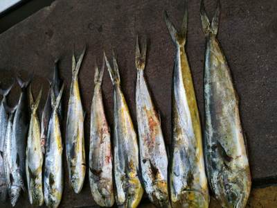 Today we participated in the Saltwater Shootout tournament right here in Pompano Beach, Florida. We ran six miles south and fished 18 lines all day long, live baiting with sardines, goggleyes and threadfin herrings. We caught lots of kingfish (25), one blackfin tuna, and a mahi-mahi. We ended up with 120 lbs of fish, but didn't win any money. It sure was a fun day though!