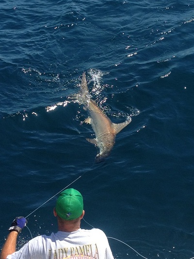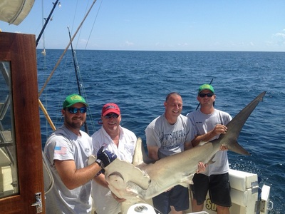 This morning was a private six-hour charter with Lee and his wife Tiffany, and Jay and his wife Brenda. Mike and I left the dock with our charter at 7 a.m. and went out to the whistle buoy trying to catch some live bait. The whistle buoy so-called because it actually whistles, is the main entrance marker to Port Everglades inlet and generally has schools of bait around it. We succeeded in catching a few live baits, and then went deep, looking for a monster fish. A few hours later Lee hooked up and brought to the boat a nice scalloped hammerhead shark. Lee wanted to get Jay a big game fish so we continued fishing in 350 feet of water with big fresh kingfish and bonito baits. We finally got the bite just before lines in, and Jay got his big game shark too. These folks were a lot of fun talking to as Lee and Tiffany are tournament bass fishermen. We heard all about the tournaments that he and Tiffany fish, and all the places they have travelled to. What an experience!