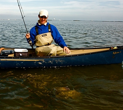 We ran over a couple nice redfish right away. Since visibility was so poor I had John start tossing a chartreuse DOA Shrimp. On his third or fourth cast a trout nailed it. It was quickly released.