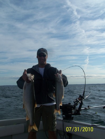 Trolling spoons in 80-100ft has been producing good cathces of brown trout. While we've been taking good numbers of browns we've manage to capture so nice salmon as well. If they're around they will bite! The we trolled for salmon and guess what? We caught some really nice lake trout.