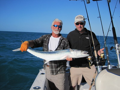 The photo shown is of angler Rodney Bromm (and Captain Dave) with a 45-inch, 20-pound king mackerel, caught on shrimp, on a recent offshore trip.