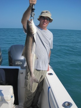 Saturday morning, I fished with Sean Flora, T.J. Taylor, age twelve, T.J's grandpa, Jessie Hernandez, and Steve Mitchell. It was kind of a déjà vous with Friday's trip because this group was also in town for a wedding and we fished in the same spots, fourteen miles west of New Pass. Once again, we hooked up with the goliaths, using crevalle jack, Spanish mackerel, and blue runners for bait, and we released five of those to 425 pounds. As if that wasn't enough of a workout for the boys, they also caught a 40-inch, 30-pound permit and a 36-inch cobia, both of those on shrimp, the permit eating a free-lined shrimp that we had out for mackerel. We also released gag and red grouper shorts, Spanish mackerel, and small mangrove snapper.