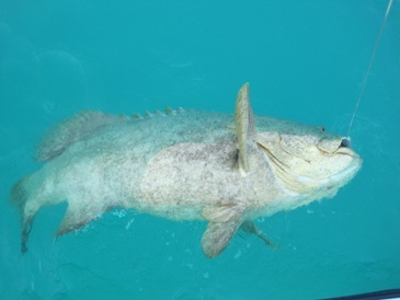 After a few days off the water, with high winds and seas persisting into mid-week, I got back offshore on Friday morning, 5/20, with long-time customer Casey Miller. This time, Casey was in town for a wedding, and he invited the groom and friends to fish with us. The group, consisting of ( in addition to Casey) groom, Scott Smith and friends Jeff Jorth, Travis Blazer, Joel Clausen and Jeremy Vaught, had no interest in keeping fish, but they had a lot of interest in wrestling with some big fish, and that we did! We headed out about fourteen miles and fished in 45 feet, over some rocky bottom. We started out using live shrimp, and those got us three Spanish mackerel to 24 inches, five keeper-sized lane snapper to 14 inches, a 13-inch pompano, seven crevalle jacks, and two cobia, one 30 inches and the other 45 inches and about 20 pounds. We released the cobia and kept the Spanish, a few jacks and a couple of lanes to use for bait for much bigger things to come. The group got to wrestle with five goliath grouper, ranging in weight from 40 pounds to over 400 pounds. The biggest one of those completely straightened a 12/0 hook, and nearly pulled two of us out of the boat! We shot some pics and video and released all.