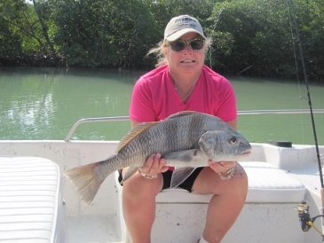 Bill Bredbenner and his fiancé, Teresa, fished Estero Bay's backwaters with me on Wednesday morning, 4/19. Conditions were not optimal, with hefty winds, low tides and some muddy waters, but the couple used live shrimp to catch and release mangrove snapper and a crevalle jack.