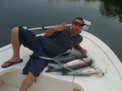 This report is going to be short and right to the point. We killed it, that's all there is to say. I have been fishing from 5:00a.m to 9:30a.m. for over a week now. The last couple of days have been packed with action all morning. My client called me Monday and asked how the fishing was. I told him that both Sunday and Monday morning we caught big numbers for summer fishing. He replied with I'll see you in the morning. So we met at Big Bridge and left out at 5:00a.m. I told him we should only have a two minute ride and we should not have to leave the area all morning. As we pulled up, my client started singing and clapping some fish song he made up. Needless to say he want be getting a record deal anytime soon, but we both laughed and I hoped the positive mojo would help too. We started with umbrella rigs and some other lines rigged with double bucktails. On our first pass one of the rods with the double bucktail started stripping line, so I rushed over to get the rod with the umbrella rig. As I was trying to clear the lines, my rod doubled over. We doubled up, so we thought. As he got his fish to the boat, I netted it with a rod in one hand and a net in the other. I quickly went back to reeling and as I got my first look at the fish I realized we had more than doubled up. I saw three stripe swimming every which way. We boated all three, which are in the picture. He looked at me and said 4 fish on the first pass, not bad. I replied with a high five and told him it had to be the fish song. This trend continued almost all morning. We doubled up countless times on the umbrella rigs. We caught 70% of our fish on umbrella rigs and 30% on the double bucktail rigs. With the 3 biggest fish coming off the double bucktail rig, and weighed between 18-20 lbs. The bite was hot till 9:30 and than it was like somebody turned the lights off, it went dead. So we called it a day and headed back to Big Bridge. Plenty of fish, no lost lures, and a short run make make for a great day in my book.