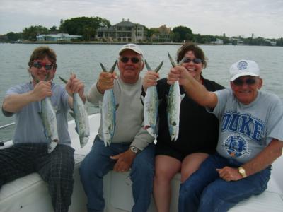 Kelly, Rob, Lee, and Glen headed out for a half day trip and cleaned up on Spanish Mackerel in the Middle Grounds of Sarasota Bay. Kelly had the first fish on, a nice eighteen inch Spanish then all anglers started catching a few. We started with small short shanked circle hooks, however when we would loose a hook on the sharp teeth of the mackerel we changed out to a 2/0 long shanked hook. We still lost a few hooks, but managed to land several more fish. We then headed to some grass flat areas looking for trout, with not much luck. Kelly did manage to catch one around sixteen inches with a belly swollen with eggs. She decided to release the fish so it could have it's young - way to go Kelly.