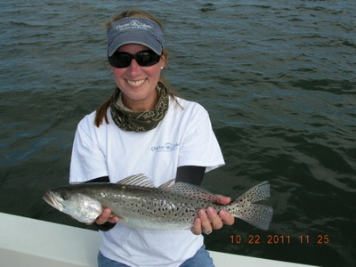 In other fishing news, the weekend of October 22nd and 23rd was the Red Bone-Cape Fear Red*Trout Tournament Series. This year again Adam Meyer and Liz Pitts of Charter Lakes Insurance Group fished with me. Liz did very well again this year taking home Grand Champion Lady Angler General Division Champion and Most Speckled trout Champion. Our team came in 1st over all in points, but the elusive keeper size Redfish was no where to be found; we got one as close at 171/2 inches (yes that hurt)! So we could not bring home Grand Champion Angler for Liz; hey there's always next year! This is a tournament to raise money for the Cystic Fibrosis; I look forward every year to fishing this tournament of a great cause.