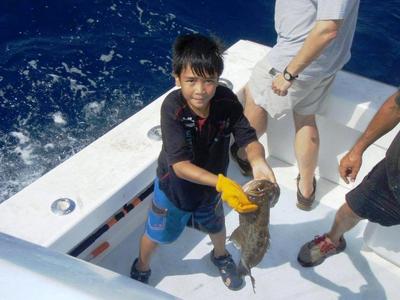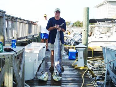 We finally got a break on the weather and got to fish 4 days this past week. On Wednesday we had the sumner family out for a 1/2 day on the Beach. The water was still pretty muddy from the hard SW wind earlier in the week, but we managed a half a dozen Spanish and 8 Bluefish. On Friday Russ and the Essilor folks joined us again for a Gulfstream trip and thankfully the weather was a lot nicer than their last trip. Fishing was not red hot, but we managed some Mahi and a great Wahoo for the summer, 54lbs. For the weekend we had an overnight trip for swordfish, but unfortunately 4 knots of current offshore just stunk for drifting. So we spent the day and part of the night doing some bottom fishing and that was a good idea. We came back in late Saturday night with almost a full fishbox, highlights including 6 Grouper, a limit of Pink snapper as well as Vermillion Snapper, Sea Bass, Grunts, Jolthead Porgy and a couple of nice Kings on the jig.