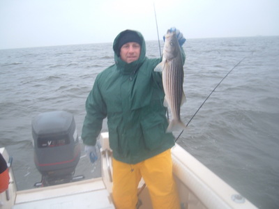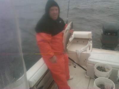 Ran an open boat trip today and had Andrew and David aboard. Greated with rain and a litle wind. Got to our grounds and setup, reading bass and had high hopes. Clammed like mad only for the boys to pull up short bass. Switched over to pulling string, again some good reads but no takes. Adrew and David were real troopers and stuck with it through the rain.