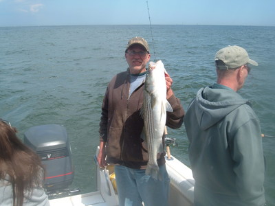 Today we had on board Mike, Ron, Jim and Val for some bassing. Good weather but had a stiff wind against the tide. First drop had nothing to show dispite good reads, second drop produced a shrt Bass. Searched for some reads and made a couple calls. Went on the troll, dispite good reads nothing to show. Changed locations and went back on the troll, had a solid knock down but didn't get the fish to the boat. Boated Cocktail Blues. Changed location and stayed out a little longer and were rewarded with Keeper Bass. Slow day the the guys and gal kept with it. Lots of laughs.