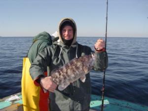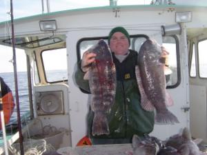 Todays open boat trip was much more productive than yesterdays . Water temps in the area we were fishing were around 42. Both whites and Greens produced quality Tog. John and his pal from LI had a real good day with John limiting out on tog to 10lbs with many of his fish between 5 and 8. His Pal had 6 keepers to 8 lbs . Yin and his partner from east coast had 16 keepers to 8lbs between them. Billy and his buddie had a slightly tougher day with 6 keepers between them. Capt. John had 6 fish and helped them to fill there filet bags.The doggies seem to have moved off and we will most likely start to carry some soft bait on trips starting after the Blow.