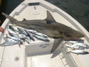 Offshore: The shark action has been exceptional. We have had many sharks over 30lbs, lots in the 50lb range, and we had one go over 100lbs and was weighed in on certified scales. My customer stated he wanted a few shark steaks… well he got them! This is some of the best action one could ask for and it is rare to go 10 minutes without a bite. We are using 40-50lb stand up tackle with 80 lb spider wire and 135lb main wire to fight these fish. This is still light tackle!!!! Watch soon for sight casting to sharks on a fly rod. We will be doing this very soon! The Spanish have thinned out a bit but are still around. Try early morning for best results. The Kings are close by and I mean close! Try the inlets for best results and this is where you will also find the larger Kings. I refuse to run more then 10 miles out this time of year for snake kings. There are plenty in the 7 to 10 mile range and this cuts down on your ride time and maximizes your fishing time.