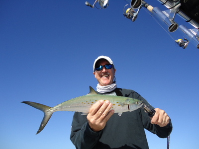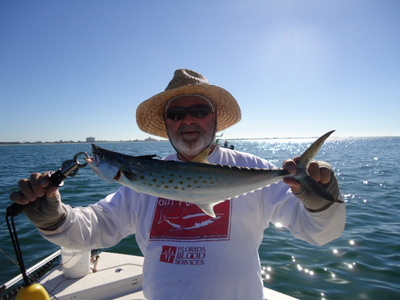 We were back at my Top Secret (not) St. Petersburg Beach Mackerel & Kingfish location. Forget looking for the birds just look for the flotilla of boats. Jim and Dave struggled to get hit the first 15 minutes so I made a small move a couple hundred yards North. Bingo the rods went off with feisty Spanish Mackerel 2-3 pounds. With the cum bag at work the bluefish moved in with double hook ups common.