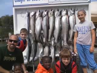 Spectacular fishing (12 in the first hour on Sunday). This past week we have been fishing in 65-115 FOW, 25-85 feet down depending on water temps. Early in the week, after the water cooled down, there was some very good fishing in front of the piers with chinook salmon, coho salmon, steelhead and lake trout being caught. After the water warmed the fishing continued out in the 65 to 115 foot depth.