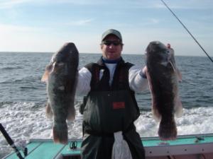 Today was our 1st trip out after the Thanksgiving Blow. We had trip sch. for both Friday and Saturday but after seeing how poor the fishing had been and the poor conditions ,they were resch. after discussion with the Groups. Capt. Ryan made his 1st trip of the 06 blackfish season and what a job he did 5 anglers and Ryan combined for 49 fish with 3 fish over 11lbs . Jay had 16 keepers with 1 at 11lbs just keeping his limit. Torres had 1 @ 11lbs and 1 @ 12lbs in his catch of 8 keepers, Donald had 7 keepers to 7lbs and Tom and John had 8 between them to 7lbs . Capt Ryan had 10 fish to 8lbs and George keept it running like atop. Seems like it getting ready to get going again , we have had many fish over 11lbs already.