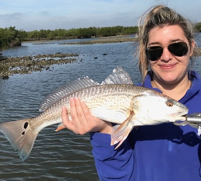 Winter has arrived in East Central Florida with our first freezing temperatures after several previous warm winters in a row, watewr temperatures dropping into the 40's, driving fish into the deepest holes and channels, and shallow water schooling fish such as redfish, Seatrout, and Black Drum onto the shallow flats during the days sunshine. More back waters fish biting in winter like Bluefish and Sheepshead, also as our subtropical fish are at risk to such low water temperatures, reports of cold stunned Snook, Tarpon, and Jack Crevalle following the coldest nights. Schooling Redfish on the flats are always a winter target, a fun sight fishing techique, finding the school, poling the boat into position, to get a bait to the fish. Canadian clients Chris and Claudia had a great backcountry trip with me, catching a bunch of different species dropping shrimp into deep holes, then after the sun was up enough we switched to hunting the flats finding a shool of Reds in a backcountry oyster lined cove, landing 5 Reds on lihjt spin tackle, Claudia got the largest.................