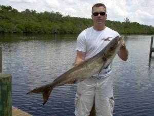 I fished 17 miles out of New Pass on Thursday, 8/23, with Paul Fenwick, Pamela Harden, Chris Dicon, John Priddy and Jackie Myers. We caught seven keeper mangrove snapper, a few Spanish mackerel and porgies, and released two goliath grouper each about 20 pounds before we hit the jackpot with a 24 pound cobia. We had hooked a small remora on a shrimp, and the cobia was hanging around trying to eat the shrimp protruding from the remora's mouth (cobia tend to swim with remora.) With a little coaxing, the cobia swam boat-side. I grabbed my gaff, and hitting it lucky, got the fish dead-on. A green cobia is notorious for its power and ability to tear up everything in the boat, and I was prepared for the worst, but I was lucky--the way the gaff caught him, he didn't even wiggle. (see photo)