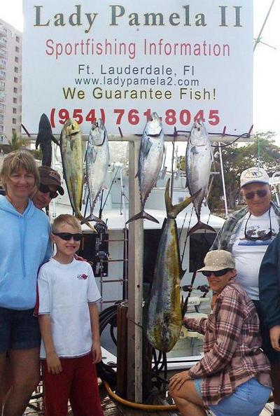Thursday Afternoon, Keith and his family joined the Lady Pamela II for an eight hour expedition offshore Fort Lauderdale. Keith had a special request to hook his 85 yr old father up with a shark during their fishing trip. Within the first five minutes of trolling, a three ft Remora ate the bait. Keith and his crew got a good look at the Remora's head and I explained what the sucker actually does, they were amazed. After we landed the Remora, we didn't get another bite for over two hours. It was time to switch things up. We ran down south to a ship wreck, popped the kites and to really try our luck, we dropped two bloody shark baits down there. Dropping on a wreck is usually a win-win situation if anything is down there, it's almost like knocking on your buddies front door. Good thing everybody on the boat was patient. An hour went by before the bobber went under, then we knew we were hooked to something big. A 45 minute battle took place before we saw the 5 1/5 ft Sandbar Silhouette. Sandbar Sharks are federally protected sea monsters, Keith's father found out just how tough Game Sharks fight when he wrestled this one to the boat. It is truly rewarding work, he had a grin on his face from ear to ear after taming this great fish. Fishing was on target today, our anglers reeled in three really nice size bonitos and two of those delicious dolphin back to back. The 24 lb'er put up one hell of a fight on 30 lb tackle, think of hunting Elephants with bebe guns.