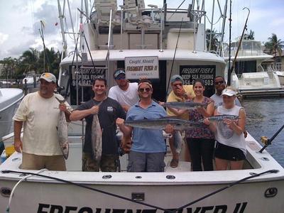 Today, Shanelle and her family from Virginia came deep sea fishing aboard the Lady Pamela II fleet. We had a full six hour adventure ahead of us and live bait was a must. We made a pit stop at the local buoy for live bluerunners just in case the Mahi showed up offshore. Live bait went in the well as the trolling gear went in the water. The Kingfish and Bonito showed themselves quite early into the trip and never left us alone throughout the day. About three hours into our fishing trip we got a killer bite on the 30 TLD. The reel was screaming and so were our anglers. A 25 lb Wahoo put up a wicked fight with its fast surface runs. Wahoo is one of my favorite fish to eat and you could just see Shanelle's family lickin' their chops. We iced our customer's dinner down and bait went back out immediately. A piece of a board was floating near by and that's always a good sign when you're looking for a fight. Another Wahoo ate to top off the trip.