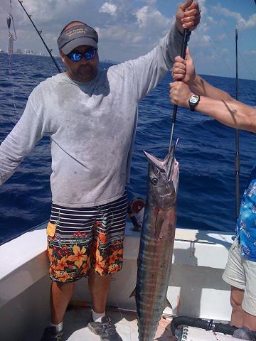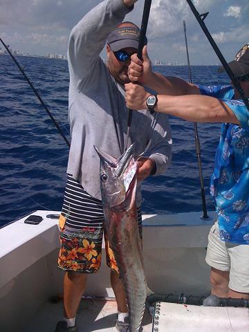 This afternoon, the Lady Pamela II set sail with two different groups of people who had never been deep sea fishing offshore. Skip, an avid trout fisherman, had never hooked a saltwater fish in his life, nor had John and his family who traveled from Denmark. The water looked great today; a beautiful blue edge, a steady current, but no fish. The further south we trolled the better the bite got. Three big King Mackerel ate along with two nice size Barracuda. Skip was in awe when he got up close and personal with the Barracuda and its mean set of teeth. After our Kings and Cudas, we got a killer bite from a monster fish. John was battling with this fish for a while before Paul got a hold of the leader and we finally got the 30 lb Wahoo in the boat. The slim, streamlined fish showed John whose boss in Fort Lauderdale. The Wahoo is one of the fastest fish South Florida has to offer and one of the tastiest fish in my book.