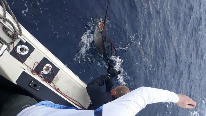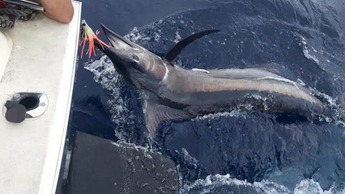 The 3 larger Marlin came out in deeper waters but Marlin number 2 was a small guy that took us by surprise just before lines up and we hooked him up less than 3km from port and released him close to the harbour mouth.