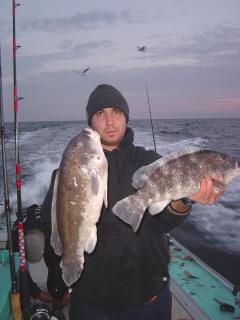 Today we had an open boat trip Fishing in the Am was pretty spoty. the guys got a little shot around noon and that didn't last long . Mike and george put in a long day but in the end it paid off Steve and John had 15 nice fish to 8lbs while Chris (seacock) had 5 to 6lbs , Norio and Izra Had 13 between them while Mike had a 3 nice keepers. Capt Mike ahad 5 to 7lbs for a day that started slowly the guys did ok with 41 keeper blacks and a few big ling.The last drop was a real bail out with 3/4 of the fish being caught there . whites out fished greens but the do most times in the shallower water.