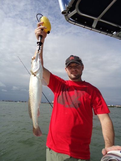 A quick run to a nearby canal resulted in 20 minutes of nothing so we made another move to a grass flat fishing 3-6'. Travis rod bent deeply as the fish pulled drag. I was in the rear of the boat and could here the fish on the surface. At first glance I thought redfish but was amazed to see a beautiful trout. The beauty checked in at 25" and 5 pounds! By the way that was Travis first trout.