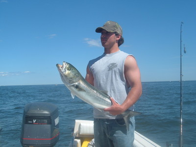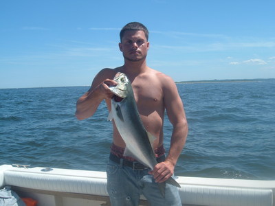 Had a Great group from NJSWF onboard today Mark (Fishon42), Vic and Marcous. Ran down the beach where the action was the day before to find a fleet in search of some action. Could find no marks to jig on and we began to pull some lime. Had a good knock down, only to come off half way to boat. Could find nothing else. Got a call of hot jigging of of Roackaway and we put the coals to the Grady and burnt up there, only to arrive just at the end. Tried jigging on suratic marks and pulling some line, but not takers. Ran over to the Knoll and began chunking, in a few minutes the Blues were in and the battle was on. Had some young Studs on board that got a workout with the deamons. Had a great day with 3 great guys, welcome on my boat any day.