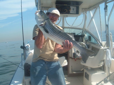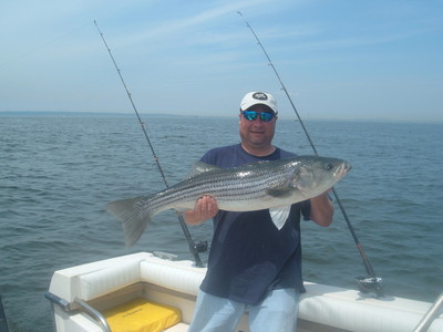 Today we had the Bennett Charter with Bill, Mike, John and Steve onboard. Bright sun and calms seas greated us as we left the dock. Anticipations were high for the day. Was going to make a run, but my little voice told me to start where I finished last night, the Right move. Took a little for the Bass to come into my slick but once they did quality fish showed up. Had keepers up to 39" and a few throw back, boated to BLues also. No mad dog bite but a pick at fish all day. Only had to make one move once we got a bite going. Guys were estatic Mike scored the 39" fish, the best of his life. Mike was pumped, seeing someone so happy is what it is about.