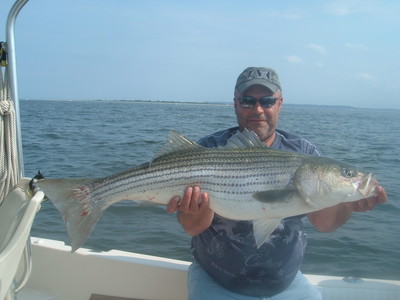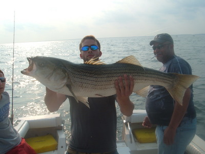 Had Dave his son Matt and Friend Alex onboard for an evening Bass trip tonight. Beautiful weather and great sea conditions. After the bite had shut down the past day and a half I was racking my brain where to go. Then remembered what my Dad had told me "when in tough times stick to the basics". And thats what we did. Ran to one of my bests spots and set up. Was not 20 min and Alex pulled in a nice 32" Bass his first, this was immediately followed by Dave's 39" Cow. This was a one drop day, stayed and boated their limit plus bonus fish most fish between 32-39", then we played catch and release. The boys arms were tired so we went in early per their request. Great night with Great guys