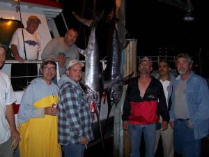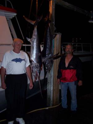 Interesting fishing this past week. But first lets go back to last week. Last Friday Night Open Boat Swordfish trip, we went 3 for 4 sowrdfish. It was one of our better night out there for swordfish since we started doing the trip. We caught a 55" forklength swordfish, a nice fat 57" forklength swordfish and another one that was too short to keep. We also missed another nice fish, but we didn't have him on for very long. This most recent Friday night open boat swordfish trip was not so good. We got completely skunked that night. First time since we've been doing the trip that we didn't even get a bite. Lousy night, the wind was wrong, current was bad, everythign was bad. Anyway, hopefully we'll do better this week and next.