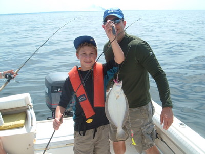 This afternoon we had aboard Elio Vacarelli, his son Matt and brother in law Mike for a 1/2 day afternoon fluking trip. Beautiful day, and good conditions. Ran out to where we wanted to go and put the lines in, was not long before the action started but it was dog fish, shorts and Robbins. Made a few drifts with the same result and deceided to make a move.