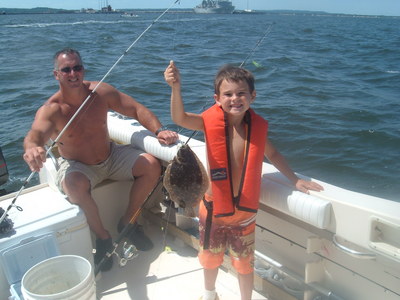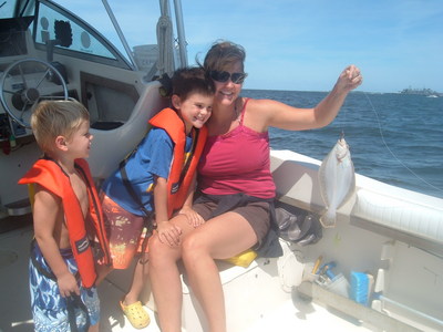 Today we had on 3 generations of the Booth Family for a half day Fluke Trip, Lance and his lovely wife, his daughter Chris and son-in-law Dave and grandsons Ryan 7 and Adian 3. Day was picture perfect but conditions were tough. Had a stiff SE wind and then it was wind against tide. Dispite this the day was a blast, young Ryan caught the first Fluke of his life and the fisrt in the boat, Lance boated a healthy 19" fish and then it was weeding through the shorts. Conditions were real tough but the fish did chew. Chris came on strong at the end and wound up high hook for the day. A great family and i really enjoyed seeing the boys taking it all in.