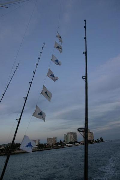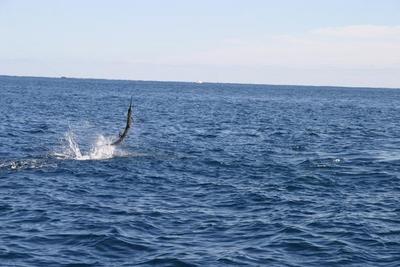 On Thursday, a fishing buddy of mine, his wife and two other friends of mine set sail on his 54' Sportfish and headed offshore in search of the Atlantic Sailfish. At 7AM on the dot, we left his dock lookin' for a fight. It just so happened that the Silver Sailfish Derby was taking place but we weren't involved, we were just looking to have a good time fishing offshore on our days off. We loaded up on live goggle eyes to suspend from the kites and the weather couldn't have been better. We reached our destination and within 10 minutes our spread was ready to attract the fish. It wasn't long before our first bite of the day and it wasn't a Sailfish. Our first fish never offered a fight as it freed itself immediately, but Ed saw the beefy 30 lb King Mackerel eat. We hung in there for a little bit longer and good thing, we hooked our first Sailfish of the day. She jumped, pulled some line then pulled the hook, it was a complete tease. After two nice bites, we weren't moving. We went for round two on the Sailfish, but this time, our fish got cut off. We didn't get discouraged; we ran a bit and relocated. "This is the spot Dave, I can feel it" said Ed. Fish after fish, it was comparable to Costa Rica Sailfishing. We hooked a double header, Diane was 5 minutes into her fight, Brian got hooked up and brought the fight to the bow, and it was great. All the tournament guys were circling our area, starring at us, thinking, "Who are these guys?" If only we were competing in the Derby! Our last bite of the day was the best. We were packing up, getting ready to hit the road but one line was still in the water. Out of no where, another Sail ate and put up one hell of a fight. We went 7 for 9 on Sailfish and had a great time.
