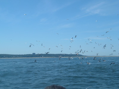 After getting slammed on the hook headed north on a 4-5 ft following sea, got some nicce marks and went on the troll, nadda. Continued north and had birds working from East Pointe to the Sea Gulls nest about 1/2-3/4 mile off the beach. Solid reads, but could not hookup, Bass were on millions of rain fish and could not get them to take.