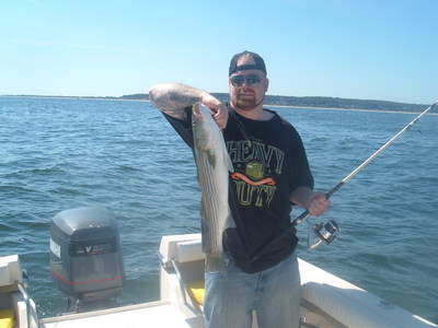 Motored ahead of the school and started casting, Jason hooked up and the fight was on, he was rewarded with a nice 29" Striper