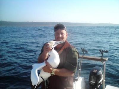 We left Durban Harbour at around 06h15 headed South and proceeded to collect live bait, and after all the bountiful mackerel catches we have been getting the past few weeks, today was disappointing and we only got 1 mackerel, but plenty Shad and Red Eye Sardines, whist fishing for live bait we had a whale come within 10m of the boat and he hung around for a long time. First I swam some live baits looking for Tuna without success and then there was a huge splash and moments later on of the reels screamed and shortly after that a Gannet popped out the water and he was hooked. I slowly wound him back to the boat and my guest distracted him with the back of the gaff whilst I grabbed him by the neck and pulled him on board. (I am getting good at this now and did not get a nip today) I then gently and slowly removed the hook and then tended his wound for him. This was a young Gannet and not as aggressive as the older ones and he was is superb condition his plumage was immaculate, these are large and beautiful birds with awesome colours and markings around the head and the bluest of blue eyes which watched every move I made with great intent until I eventually released him where he swam away and still hung around the boat.