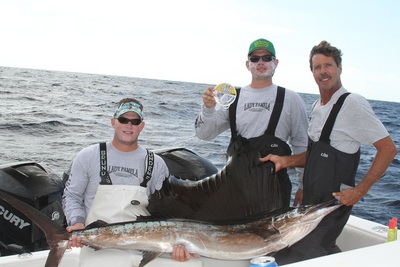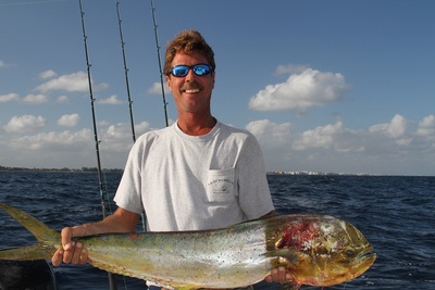 In the morning, we picked up six dozen goggleyes from T & T live bait and ran north 30 miles to just offshore Boynton Beach inlet. We put up the kites, and as soon as we got the baits in we hooked up a double header sailfish, landing one out of the two fish. By 10:00 a.m. we had released another four sails and lost one. The outgoing tide had the current running at the inlet by this time so we reset the kites right in front. It didn't take long before we hooked another sail, then another. We now had released six sails and lost two. Every time we set back up in front of the inlet we got a bite, so we kept jumping and catching sailfish. We ended the day with 10 for 12 on the sails. We also caught 10 nice mahi-mahi up to 20 lbs, a couple of blackfin tunas, a king mackerel, two silky sharks, and a barracuda. We ended up catching over 30 fish. Not too bad!