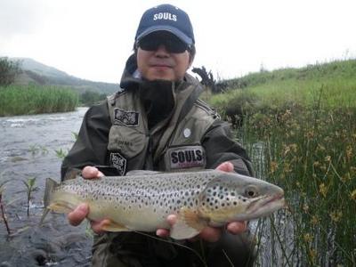 We left Durban at around 04h00 and headed up towards the Drakensburg to the Bushmans River for a day of wild brown river trout fishing. It was overcast and misty all day but not cold. The river water was turbid with about 1.2m (4ft) visibility. We were a little dubious, but decided to go ahead anyway.