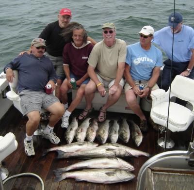 This last Saturday I had the Hammond brothers, John and Jim, on a full day trip out of Rock Harbor. They come with me once a year, They both are dentist and live in central Mass. Anyway, they had a particularly good year this time. It's not that they don't get a fair amount of stripers when they go, but fishing has been pretty easy in years past, This season you have to work for your fish at times. Well, you tell me if this load of fish had them working a bit.