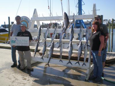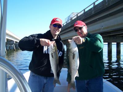 Surf fishing in duck really turned on over the past two days. Black drum, puppy drum, bluefish, sea mullet, and trout have all made a great showing. Jay Bender reported catching 18 speckled trout last night behind the Hampton Inn, and catching 25 behind Sharky's this morning. The Sea Hag with Captain Frank McCargo fished a half day trip this morning and caught a limit of nice sized king mackerel, a nice jack, and a black tip shark. Frank was fishing at the AR145. The water temperature at the Duck Pier is 69.4. There is a high tide at 1:48pm. Just a note about "years of experience", Captain Clay Hauser, aka, "small boat" , originally got his work permit in 1978 in order to work at the Oregon Inlet Fishing Center. He worked the docks for a few years and then got a job as a mate. He fished with people like Lee Perry, Duke Spencer, Devon Cage, Bobby Smith, and many other reputable captains. Clay then got his captains license in 1996 and started running a boat called the Tide Line. Clay ran the Tide Line until 2007. He now is the owner-operator of the Miss JD. I know some BIG boat captains that were still in diapers in 1978. Below are some photos, one is of Frank's catch, and the other is of two stripers caught in-between the Currituck Bridges on the Miss JD.